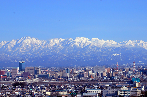 呉羽山展望台からは北アルプス・立山連峰に抱かれた富山市街が一望できる